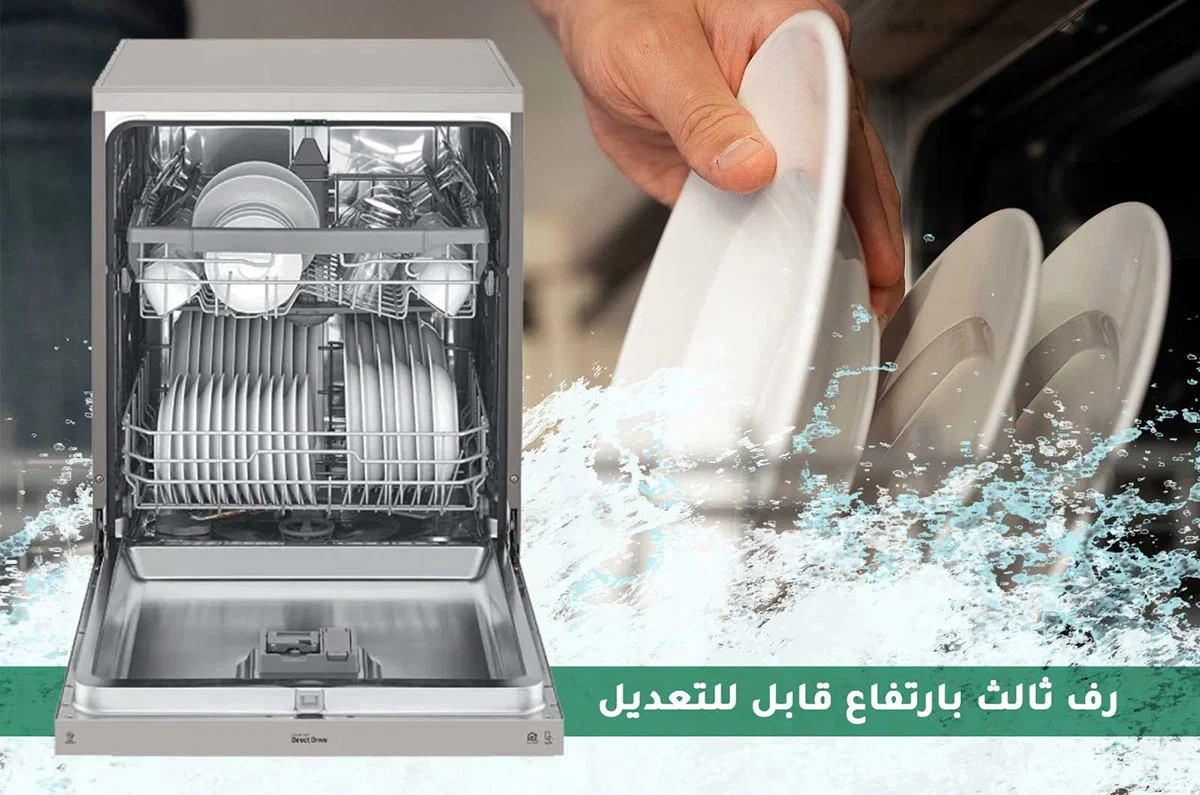LG dishwasher with four washing arms and 14 place settings